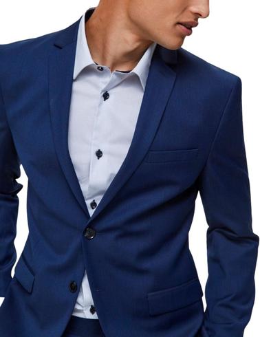 Americana Selected Homme para hombre. Blazer de estilo clásico. Corte slim. Dos aberturas a la espalda. Bolsillos figurados con tapeta. Dos botones. Color azulón. Tejido elástico con trama tipo espiguilla. Combínalos con los pantalones a juego y te llevará un bonito traje.