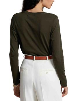 Camiseta Polo Ralph Lauren para mujer. Camiseta básica de manga larga y cuello redondo. Ajuste regular. Tejido de algodón muy suave. Diseño liso verde oliva. Caballo distintivo de la marca bordado en el pecho. Es la prenda básica comidín de todo el invierno para llevar con tus americanas y chaquetas más gruesas.
