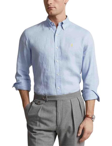 Camisa Polo Ralph Lauren para hombre confeccionada en tejido de lino 100%. Corte slim fit y cuello con botones. Manga larga. Diseño liso en azul celeste. Este modelo se adapta muy bien para un estilo informal con unos pantalones chinos para eventos desenfadados. Bordado distintivo de la marca en el lado izquierdo del pecho. Apuesta por prendas de calidad como las que te ofrecemos en Moncho moda, tienda multimarca online, haz tu pedido y lo recibirás en casa entre 24-48 horas.